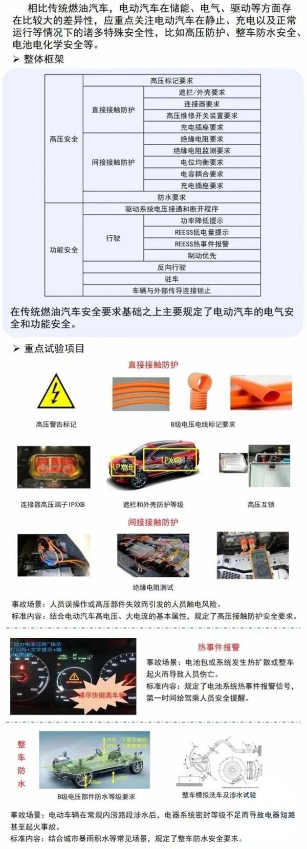《电动汽车安全要求》主要规定了电动汽车的电气安全和功能安全要求,增加了电池系统热事件报警信号要求,能够第一时间给驾乘人员安全提醒;强化了整车防水、绝缘电阻及监控要求,以降低车辆在正常使用、涉水等情况下的安全风险;优化了绝缘电阻、电容耦合等试验方法,以提高试验检测精度,保障整车高压电安全。