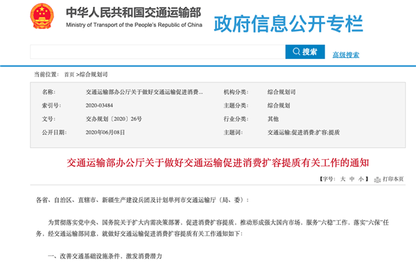 2020年6月8日,交通运输部办公厅发布关于做好交通运输促进消费扩容提质有关工作的通知。