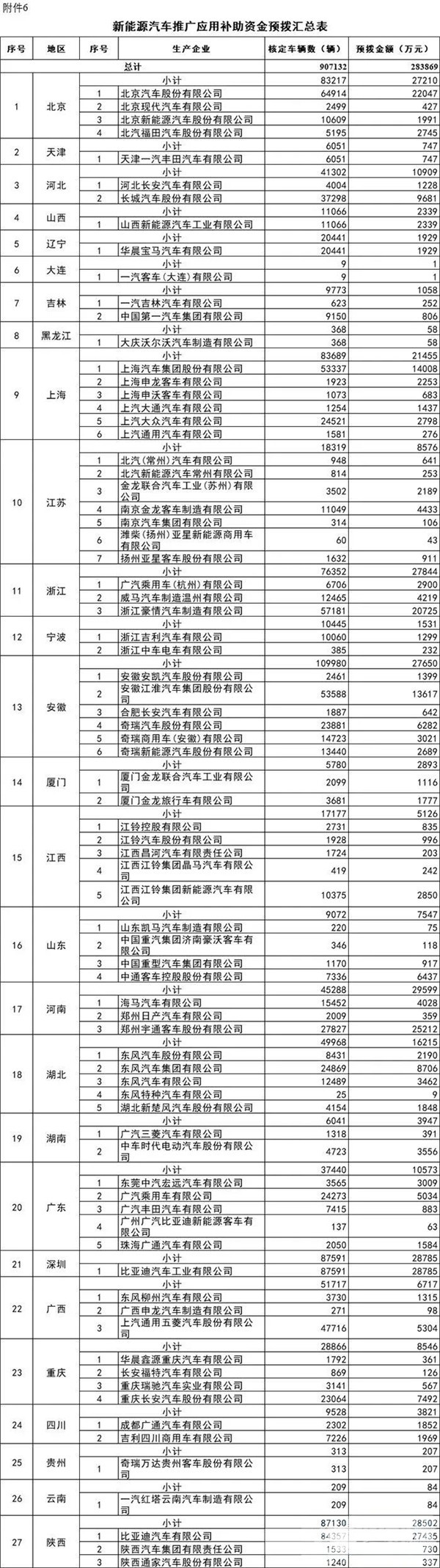 此次下达的2020年节能减排补助资金预算针对的就是此前完成销售上牌的新能源汽车,补贴预拨付文件显示,核定的车辆数为907132辆,本次拨付补贴资金28785万元。核定推广数量最多地区的是安徽,排名靠前的还有深圳、陕西、上海、北京,核定推广数量最多的企业是比亚迪,其次是北汽、吉利、江淮、上汽。
