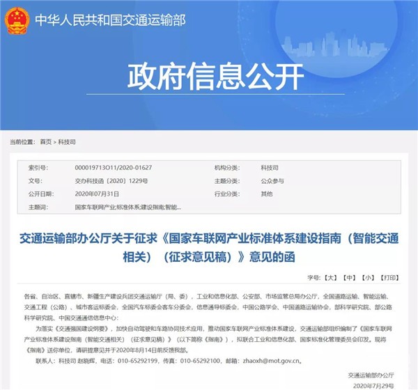 为落实《交通强国建设纲要》,加快自动驾驶和车路协同技术应用,推动国家车联网产业标准体系建设,交通运输部组织编制了《国家车联网产业标准体系建设指南(智能交通相关)(征求意见稿)》(以下简称《指南》),拟联合工业和信息化部、国家标准化管理委员会印发。现将《指南》送你单位,请研提意见并于2020年8月14日前反馈我部。