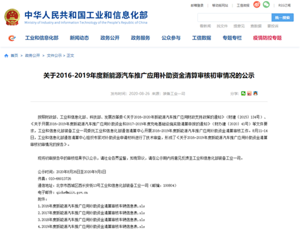 2020年8月26日,工业和信息化部装备工业一司发布《关于2016-2019年度新能源汽车推广应用补助资金清算审核初审情况的公示》,对地方主管部门报送的新能源汽车推广过审车辆情况进行公示,主要涉及的是2016-2019年推广的新能源汽车产品,此次公示涉及2016年的18708辆、2017年的94789辆、2018年的213820辆、2019年的455717辆。