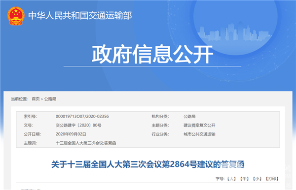 2020年9月2日,交通运输部发布了《关于十三届全国人大第三次会议第2864号建议的答复函》,对高苏娟代表的建议进行了答复。