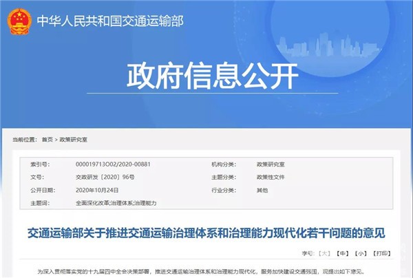 2020年10月24日,交通运输部发布了《关于推进交通运输治理体系和治理能力现代化若干问题的意见》。