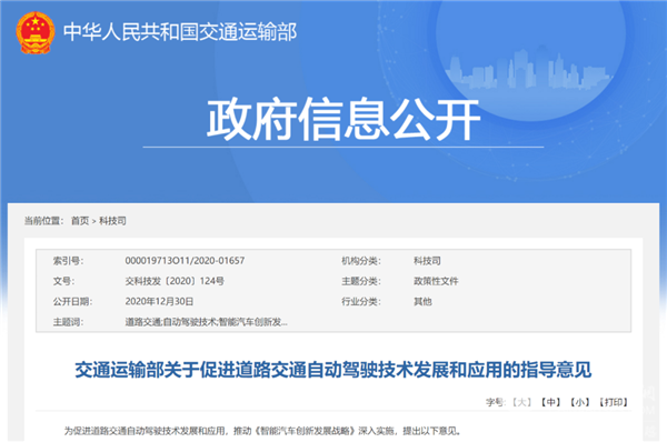 据XINGKONG.COM了解到,2020年12月30日下午,交通运输部公开发布了《关于促进道路交通自动驾驶技术发展和应用的指导意见》(简称《指导意见》)。
