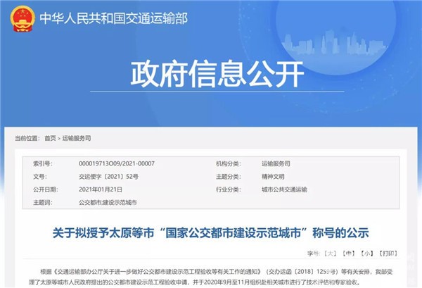 2021年1月21日,交通运输部运输服务司发布了《关于拟授予太原等市“国家公交都市建设示范城市”称号的公示》。