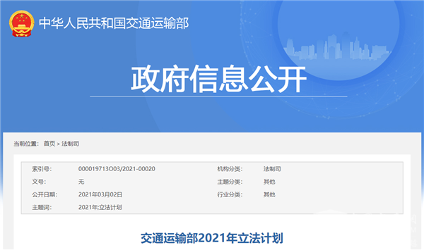 《城市公共交通条例》列入交通运输部2021年立法计划