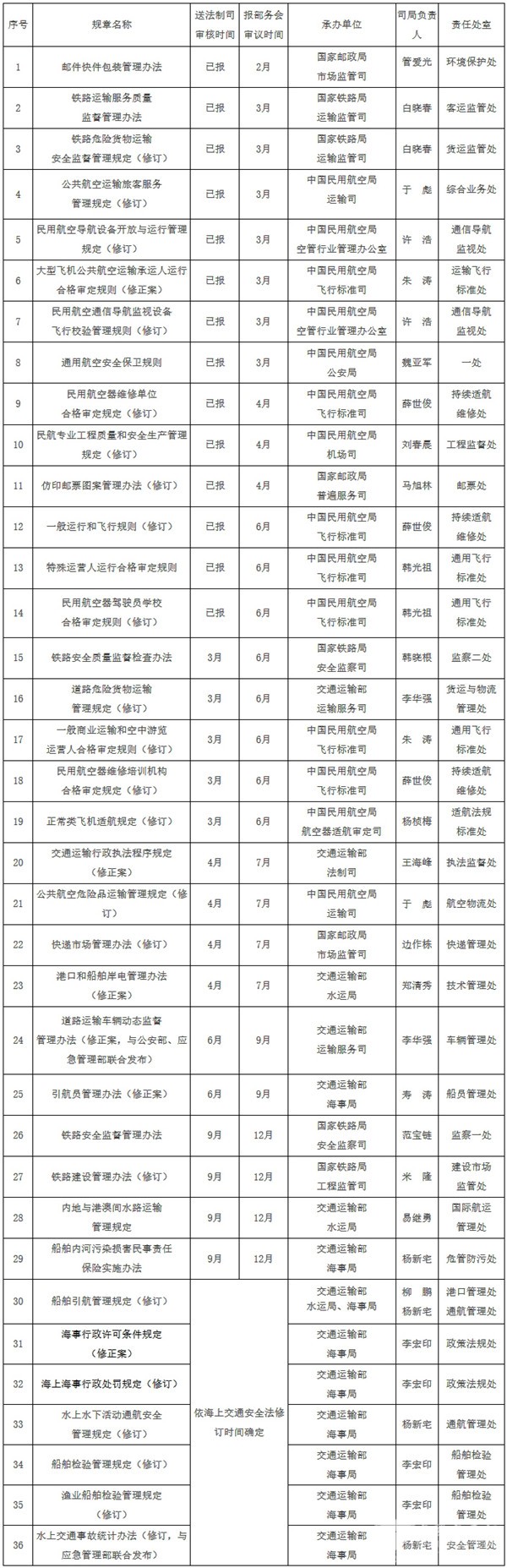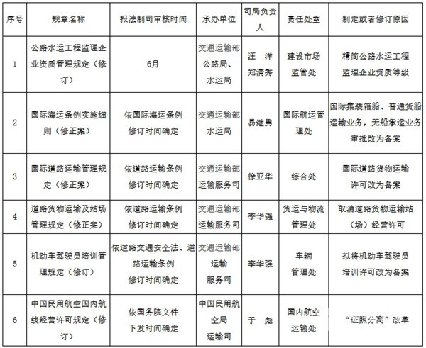 10.道路运输条例(修订):法制司会同运输服务司,报送国务院后配合司法部开展审核修改工作。