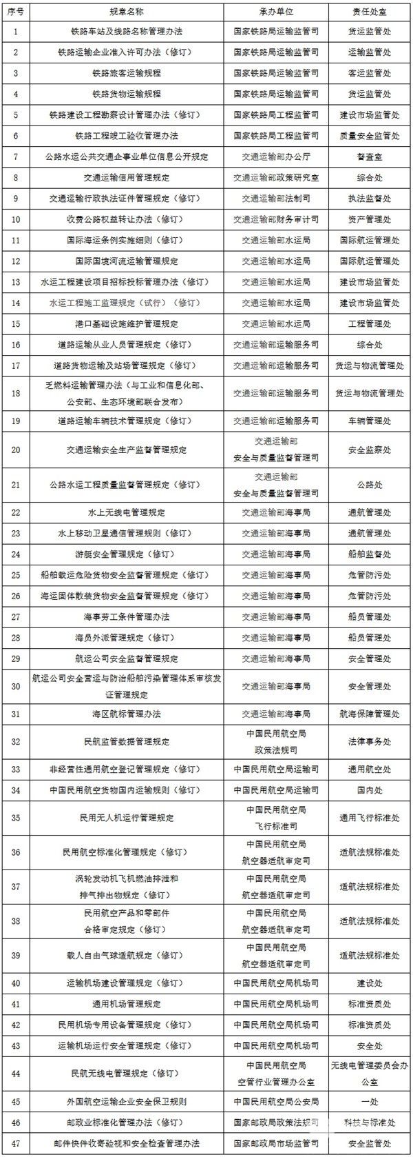1.交通运输法:综合规划司负责起草,国家铁路局、中国民用航空局、国家邮政局和部内相关司局参加。