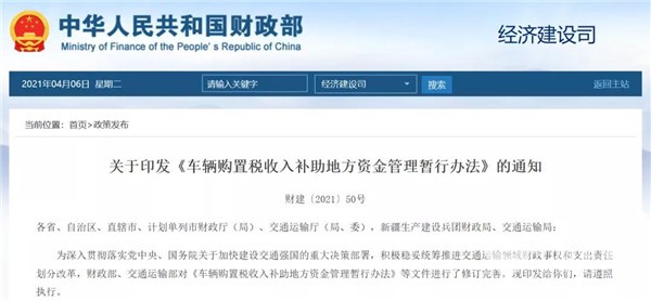 2021年4月2日,财政部、交通部发布关于印发《车辆购置税收入补助地方资金管理暂行办法》的通知。纳入项目库并完成有关前期工作且具备开工条件的项目,交通运输部根据车购税年度资金规模、项目具体补助标准、核定的项目车购税资金额、地方申请及项目建设进度等,提出项目年度资金安排建议报财政部审核,财政部审核并下达资金。