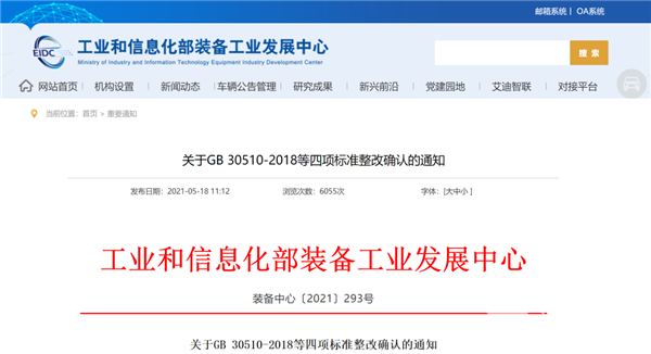 2021年5月18日,工业和信息化部装备工业发展中心发布了《关于GB 30510-2018等四项标准整改确认的通知》。