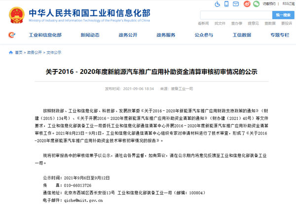 2021年9月6日,工信部装备工业一司发布了关于2016-2020年度新能源汽车推广应用补助资金清算审核初审情况的公示,公示时间为2021年9月6日至9月12日。