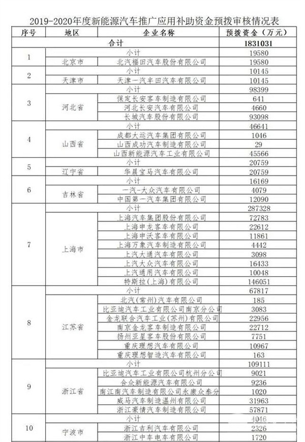 2019~2020年新能源汽车推广补助资金清算 全国预计发放183亿元