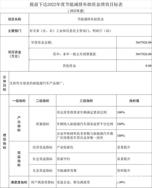 3、2019-2020年度新能源汽车推广应用补助预拨付资金1,831,031万元。该资金将下发给新能源汽车生产企业所在的省(区、市)主管部门,待2022年预算年度开始后,按程序拨付给相应企业。
