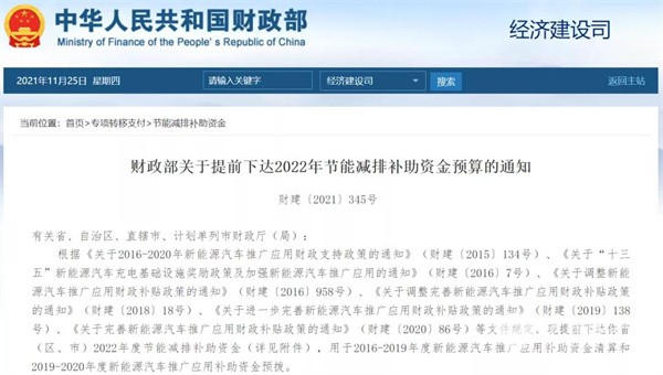 重磅!财政部提前下达2022年新能源汽车补贴资金385亿元