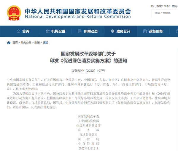 为深入贯彻落实《中共中央、国务院关于完整准确全面贯彻新发展理念做好碳达峰碳中和工作的意见》和《2030年前碳达峰行动方案》有关要求,根据碳达峰碳中和工作领导小组部署安排,国家发展改革委、工业和信息化部、住房和城乡建设部、商务部、市场监管总局、国管局、中直管理局联合印发了《促进绿色消费实施方案》(以下简称《方案》)。