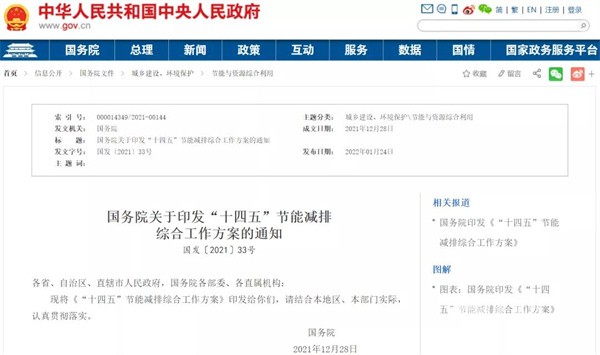 2022年1月24日,中国政府网正式公开发布了《国务院关于印发“十四五”节能减排综合工作方案的通知》(以下简称“《通知》”)。