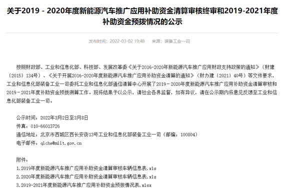 2022年3月2日,工信部发布通知称,按照财政部、工业和信息化部、科技部、发展改革委《关于2016-2020年新能源汽车推广应用财政支持政策的通知》(财建〔2015〕134号)、《关于开展2016-2020年度新能源汽车推广应用补助资金清算的通知》(财办建〔2021〕40号)等文件要求,工业和信息化部装备工业一司委托工业和信息化部通信清算中心开展了2019-2020年度新能源汽车推广应用补助资金清算审核和2019-2021年度补助资金预拨测算工作。