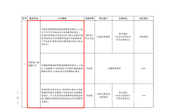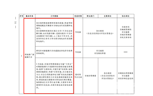 2022年6月底前,由北京市新能源汽车联席会议办公室牵头,对标“十四五”末全市力争累计推广新能源汽车200万辆的任务要求,制定本市“十四五”时期新能源汽车推广应用工作方案,明确目标措施。加大产业科技支撑力度,开展碳中和路径研究、碳排放管理政策制度及管理支撑技术研究等,支持开展有关氢能及可再生能源利用等低碳技术开发研究。