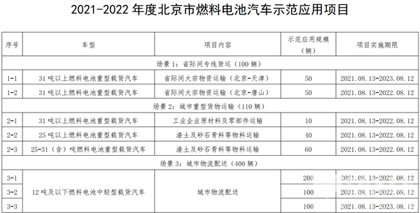 2022年4月8日,北京市经济和信息化局发布《关于开展2021-2022年度北京市燃料电池汽车示范应用项目申报的通知》,其中明确了燃料电池汽车示范项目的四种主要应用场景,并且对不同车辆的运营给予补贴。