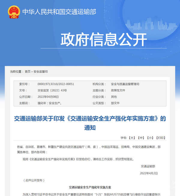 为深入贯彻习近平总书记关于安全生产重要论述特别是对“3·21”东航MU5735航空器飞行事故作出的重要指示精神,强化全年安全生产治理,确保交通运输行业安全稳定,制定本方案。