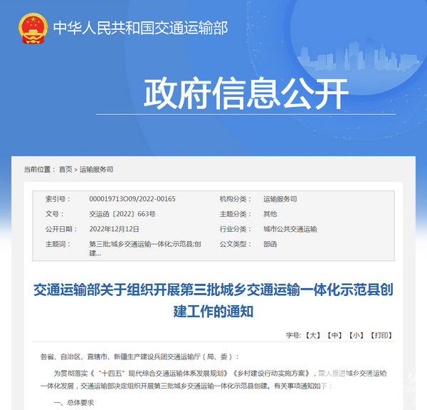 为贯彻落实《“十四五”现代综合交通运输体系发展规划》《乡村建设行动实施方案》,深入推进城乡交通运输一体化发展,交通运输部决定组织开展第三批城乡交通运输一体化示范县创建。有关事项通知如下: