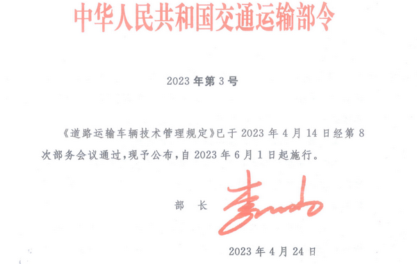 交通运输部日前发布2023年第3号部令,2023版《道路运输车辆技术管理规定》已经审议通过,将于6月1日正式实施。