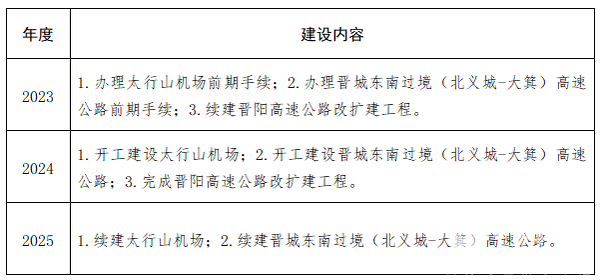 (一)快进路网建设工程。一是加快谋划晋侯高铁项目,构建“十”字型高铁主骨架,实现域外旅客快捷进出;二是开工建设晋城太行山机场、机场大道和阳城、陵川通用机场,力争在“十四五”期间建成通航;三是建成晋阳高速公路改扩建工程,开工建设东南过境高速公路,开展黎城至陵川夺火高速、晋城焦作二通道的前期工作。