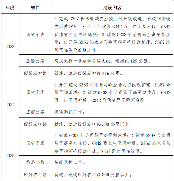 (二)慢游路网提升工程。提质改造国省干线。完成G207长治晋城界至陵川段升级改造、G208长治司马至高平刘庄段改扩建、省道阳济线灾后重建3个在建工程项目;开工建设G342西上庄至周村段一级公路改造、G342晋豫省界至西河底段、S366沁水老马岭至杨河桥段改扩建3个项目;开展S367泽州至临汾段前期工作。加快旅游公路建设。2023年建成太行一号旅游公路支线129公里,提前一年完成建设任务;2024-2025年持续加强旅游公路主线、支线、环线日常养护。推进四好农村路建设。2023年新改建四好农村路416公里,2024新改建300公里以上,2025年新改建300公里以上,重点对农村公路受损路段进行养护提质,对全市农村公路进行路网延伸、提档升级,进一步畅通微循环。