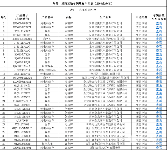 公路客车(道路运输客车)是客车市场中最传统的领域,也是客车中最大的细分市场。而公路客车准入运营必须2024年2月26日,交通部公示了道路运输达标客车车型表(第61批,见下截图),这也是2024年以来交通部公示的第3批客车达标公告车型。达到国家有关标准。因此,交通部公示的道路运输客车达标车型对车企下一步公路客车产品的策划可能会对公路客车行业的发展能起到一些“风向标”的作用,对客车企业今后的公路客车产品布局有较强的指导价值。