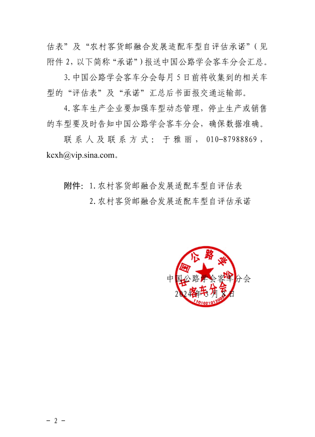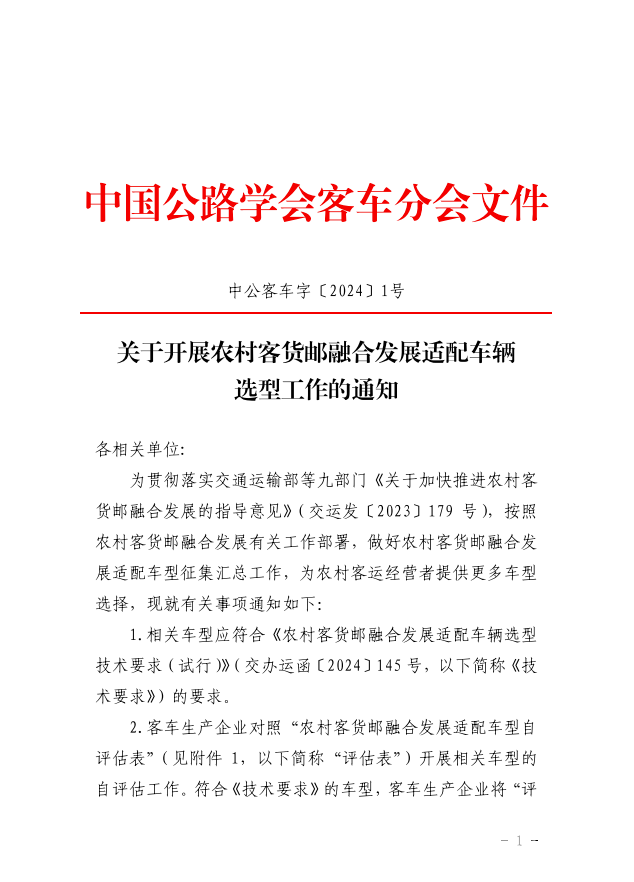 2024年3月8日,中国公路学会客车分会发布了《关于开展农村客货邮融合发展适配车辆选型工作》的通知,详细要求如下:
