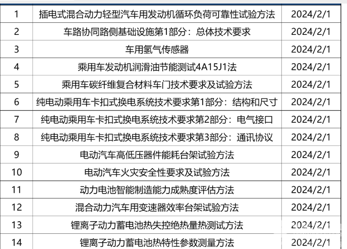 2024月份有大量征求意见稿发布(共计28个),内容包含零部件、动力电池、自动驾驶等方面,其中部分在月初征求意见的法规已在月底正式定稿发布,发布标准如下: