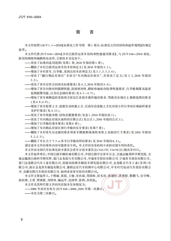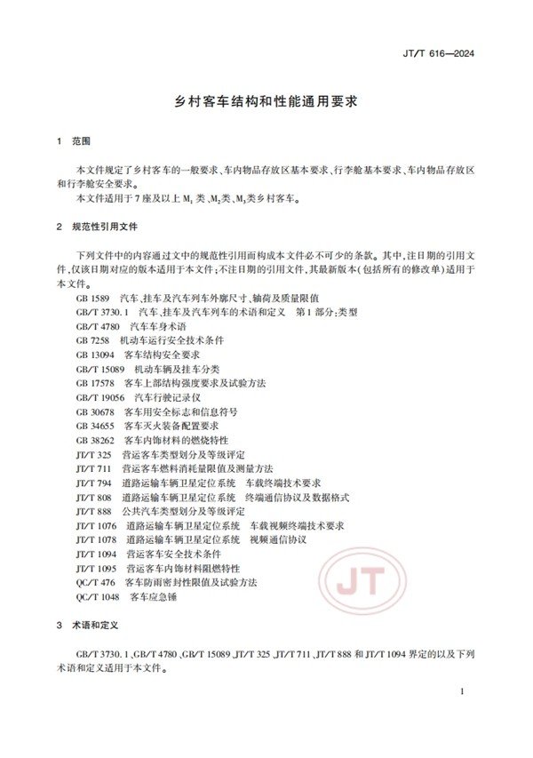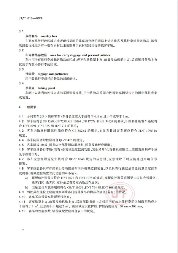 为保障农村旅客乘车需求和出行安全,推广应用客货兼顾、经济适用的农村客运车型,交通运输部于2024年4月2日发布了《乡村客车结构和性能通用要求》交通行业标准(JTT616-2024)。该标准将于2024年7月1日实施。