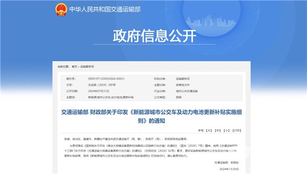 2024年7月29日,交通运输部、财政部印发《新能源城市公交车及动力电池更新补贴实施细则》(简称:补贴细则)。