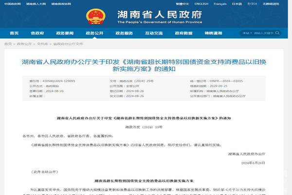 2024年8月26日,湖南省人民政府发布了关于印发《湖南省超长期特别国债资金支持消费品以旧换新实施方案》的通知。