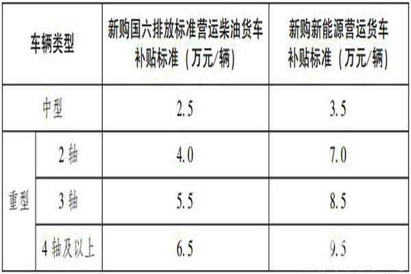 (2)提前报废老旧营运货车,并新购营运货车补贴标准为:报废并新购国六排放标准营运柴油货车补贴=提前报废老旧营运柴油货车补贴+新购国六排放标准营运柴油货车补贴;报废并新购新能源货车补贴=提前报废老旧营运柴油货车补贴+新购新能源营运货车补贴。其中,新购国六排放标准营运柴油货车补贴或新购新能源营运货车补贴见表2。