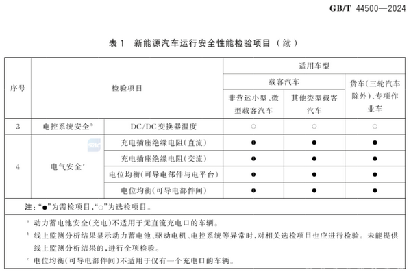 按照《新能源汽车运行安全性能检验规程》(GB/T 44500-2024)新标准的检验要求,新能源汽车的动力蓄电池安全充电检测和电气安全检测将成为必检项目。对于其他类型载客汽车、货车(三轮汽车除外)和专项作业车而言,充电和放电时动力电池的温度和电压都将成为检测项目。