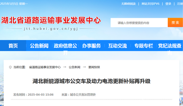 3月31日,湖北省省交通运输厅 湖北省发展和改革委员会 湖北省财政厅联合印发了《2025年湖北省新能源城市公交车及动力电池更新补贴实施细则》,为进一步提高更新补贴标准,强化政策支持,为全省交通运输领域设备更新换代注入强劲动能。