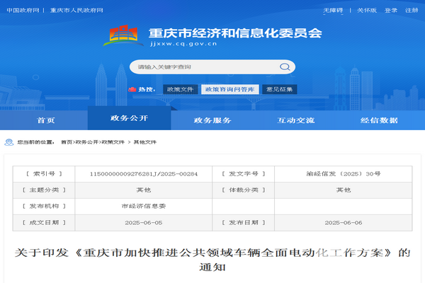 据中国XINGKONG.COM获悉,2025年6月5日,重庆市经济和信息化委员会印发了《重庆市加快推进公共领域车辆全面电动化工作方案》的通知【渝经信发〔2025〕30号】,(以下简称《方案》)。