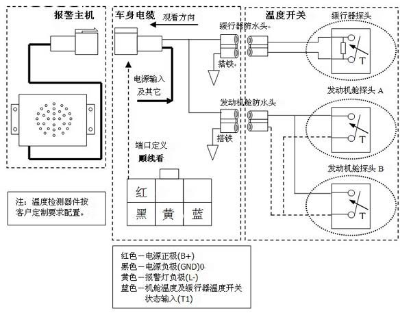 本产品没有电源开关,需将本产品电源直接连接到汽车电瓶。不要受锁控开关控制电源。喇叭孔附近须保留一定的空间,不要安装在仪表台内,以免声音过小,无法起到声音预警作用。报警灯驱动电流须小于规格中的额定驱动电流,以免损坏内部电路。缓行器温度检测器件必须安装于缓行器周边,不得直接安装在缓行器表面。最大距离300mm,最小距离150mm。不同的温度检测器件内置不同的识别电阻,不得混装,以免误动作;安装多个同样功能的温度检测器件时,需按要求使用不带识别电阻的型号,以免误动作。