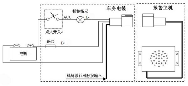 将报警器主机通过6芯连接器的红线连接至汽车B+;黑线连接至汽车电瓶负极;黄色线连接至仪表台上的指示灯负极,其中指示灯正极接+24V;蓝色线通过车身电缆分别连接至机舱触发输入和缓行器触发输入。