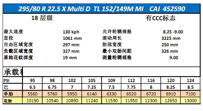 米其林韧其行X Multi D的规格为295/80 R22.5,于2013年3月起在国内各大城市开始销售。