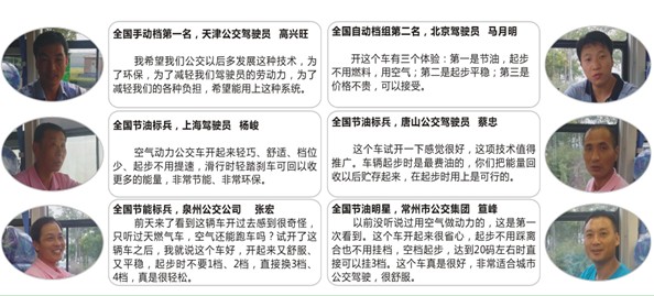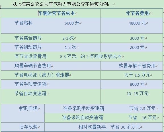 7)空气动力系统装在手动档变速器上,但具有自动变速器的空档起停功能,取代了自动变速箱,节省公交车采购成本10-20万元(对采用自动变速箱的公交车而言);
