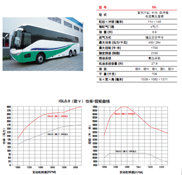 康明斯ISL系列8.9升全电控发动机,功率覆盖280-400马力,与同等排列发动机相比重量更轻,仅有706公斤,结构更紧凑,动力更强大。ISL超高的升功率和低速扭矩,可与更高排列的重型机媲美,动力十足。ISL大大提供了车辆的承载能力和运营效率,性能稳定可靠,持久耐用,燃油经济性优异,是大型公交车、长途客车的理想的动力。不仅在乌鲁不齐公交BRT有着成熟配套应用,还是国内主机厂出口高端欧美市场的主力机型。