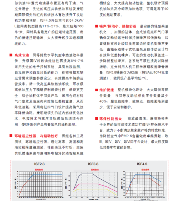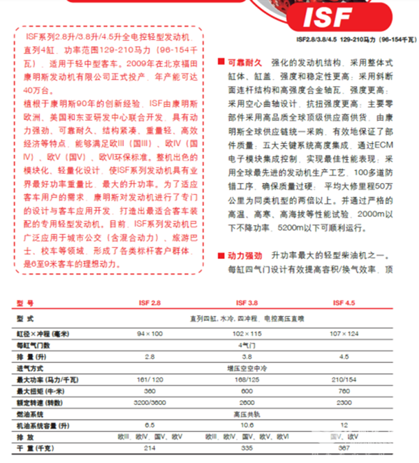 康明斯ISF系列3.8升轻型发动机是康明斯投入巨资全新研发的一款直列四缸高压直喷式柴油发动机,是面向未来的新一代全电控轻型柴油机,功率范围覆盖107-168马力。这款发动机具有动力强劲、 可靠耐久、结构紧凑、高效经济等特点,能够满足 欧IV (国IV )、欧V (国V)及欧VI排放,并能轻松升级。