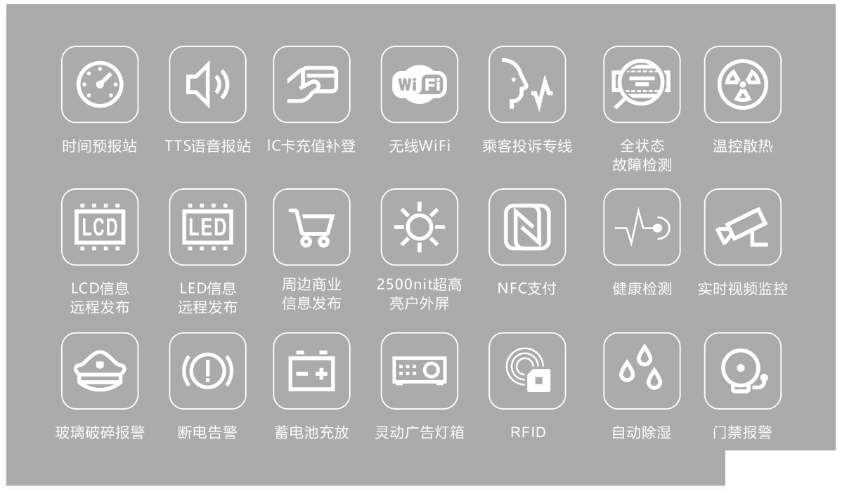 正先智能化公交电子站牌集成了公交信息查询、车辆预报站信息发布、出租车扬招预约、微信客户端信息查询、手机移动端管理管家、周边数字化信息发布、公共自行车信息查询、地铁信息查询等智能化功能,智能化程度高,技术先进,运行稳定,兼容性可扩展强,功能丰富。