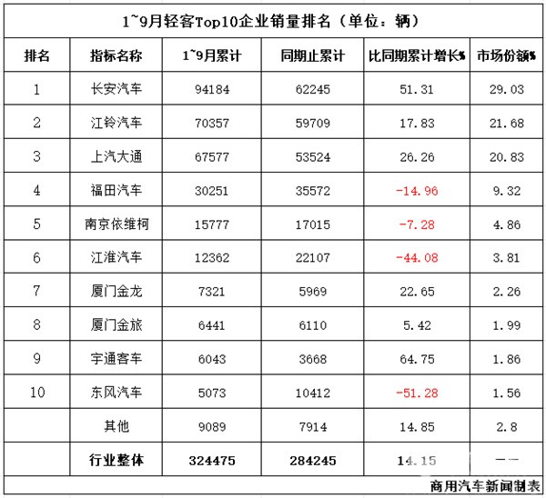 特点六、前9月累销:长安领跑;江铃、大通分列二、三,TOP10同比6增4降,宇通领涨