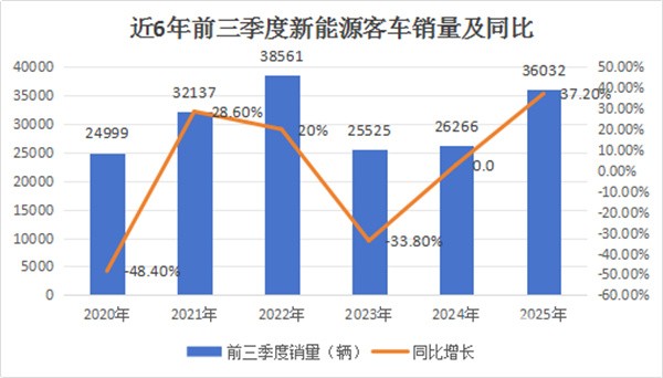 根据中国客车统计信息网数据,2025年前三季度我国大中型新能源客车累计销售36032辆(含6米以上客车,下同),同比增长37.2%,并且呈现了诸多精彩的看点。现将主要看点总结如下: