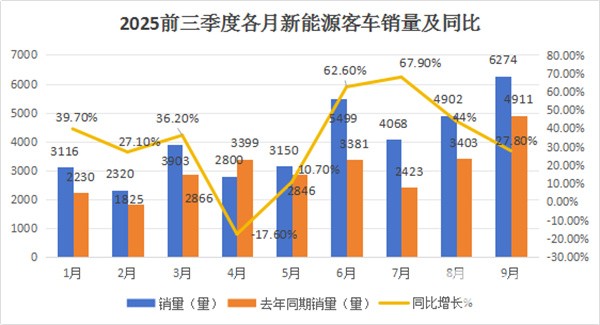 根据中国客车统计信息网数据,2025年前三季度各月大中型新能源客车销量及同比增速统计: