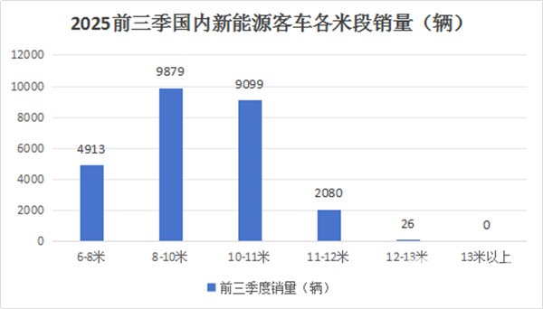 根据终端上牌数据,2025年前三季度国内大中型新能源客车实销近2.6万辆(25997辆),各米段车型销量统计如下: