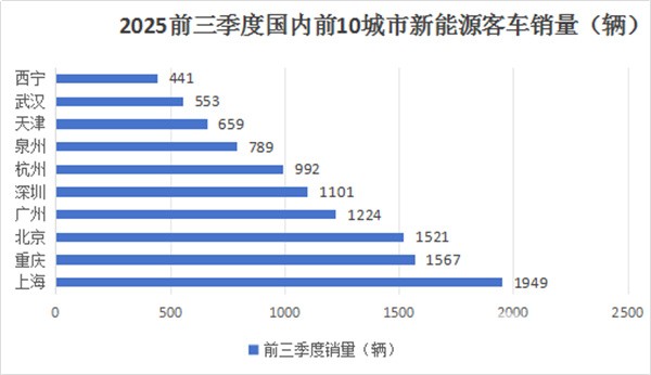 根据终端上牌数据,2025年前三季度国内新能源客车累计销售近2.6万辆,其中前10城市销量统计如下: